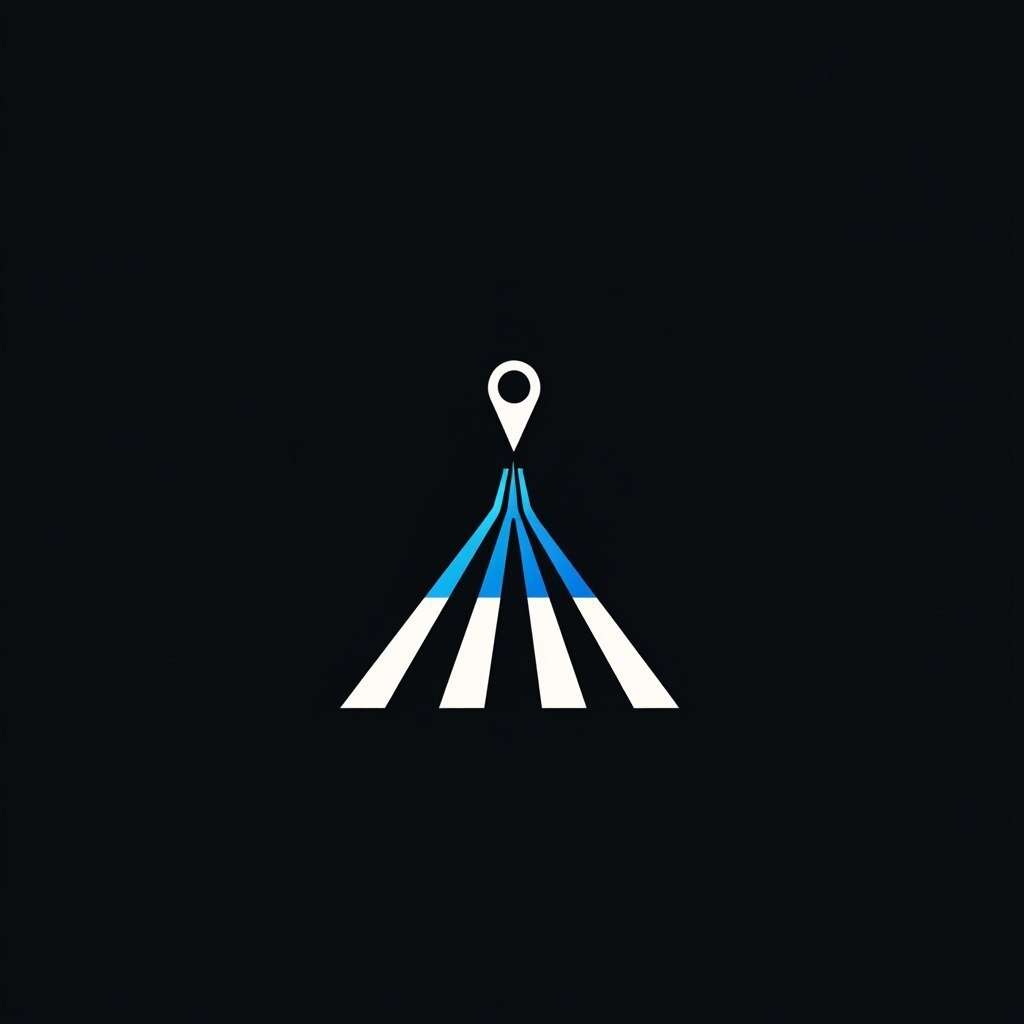 Создано на основе запроса: A simple vector logo of a road with white and blue lines, black background, minimalistic style, with a location