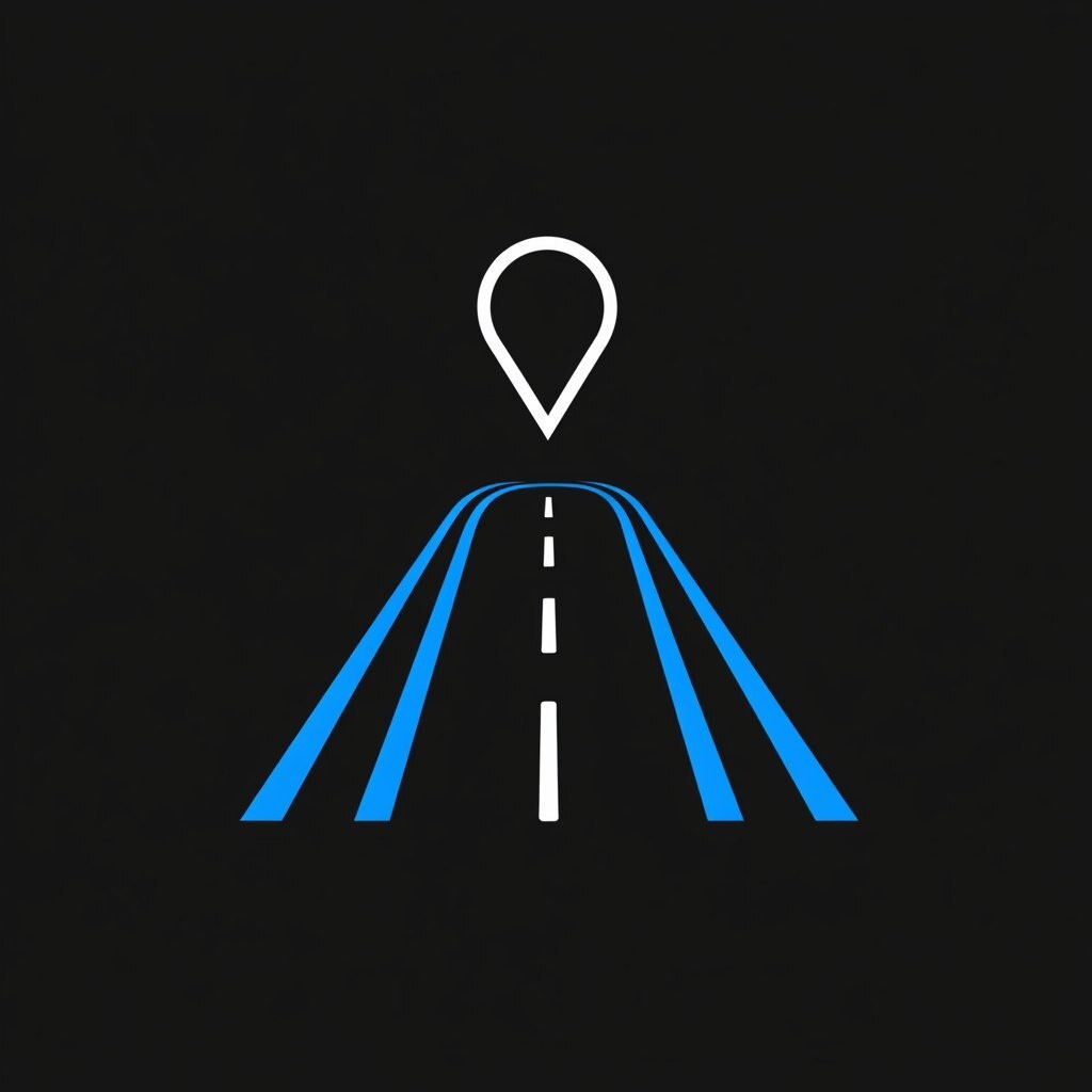 Создано на основе запроса: A simple vector logo depicting a road with blue and white lines on a black background, featuring a map pin icon