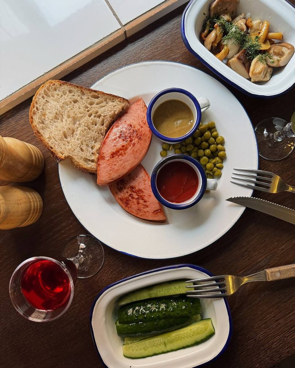 Стейк из докторской колбасы (да) выпустила питерская рюмочная. РУССКОЕ изысканное блюдо подаётся с горошком, куском хлеба, горчицей и кетчупом. Но есть нюанс: степень прожарки выбрать не получится, потому что «всё уже решено за вас».