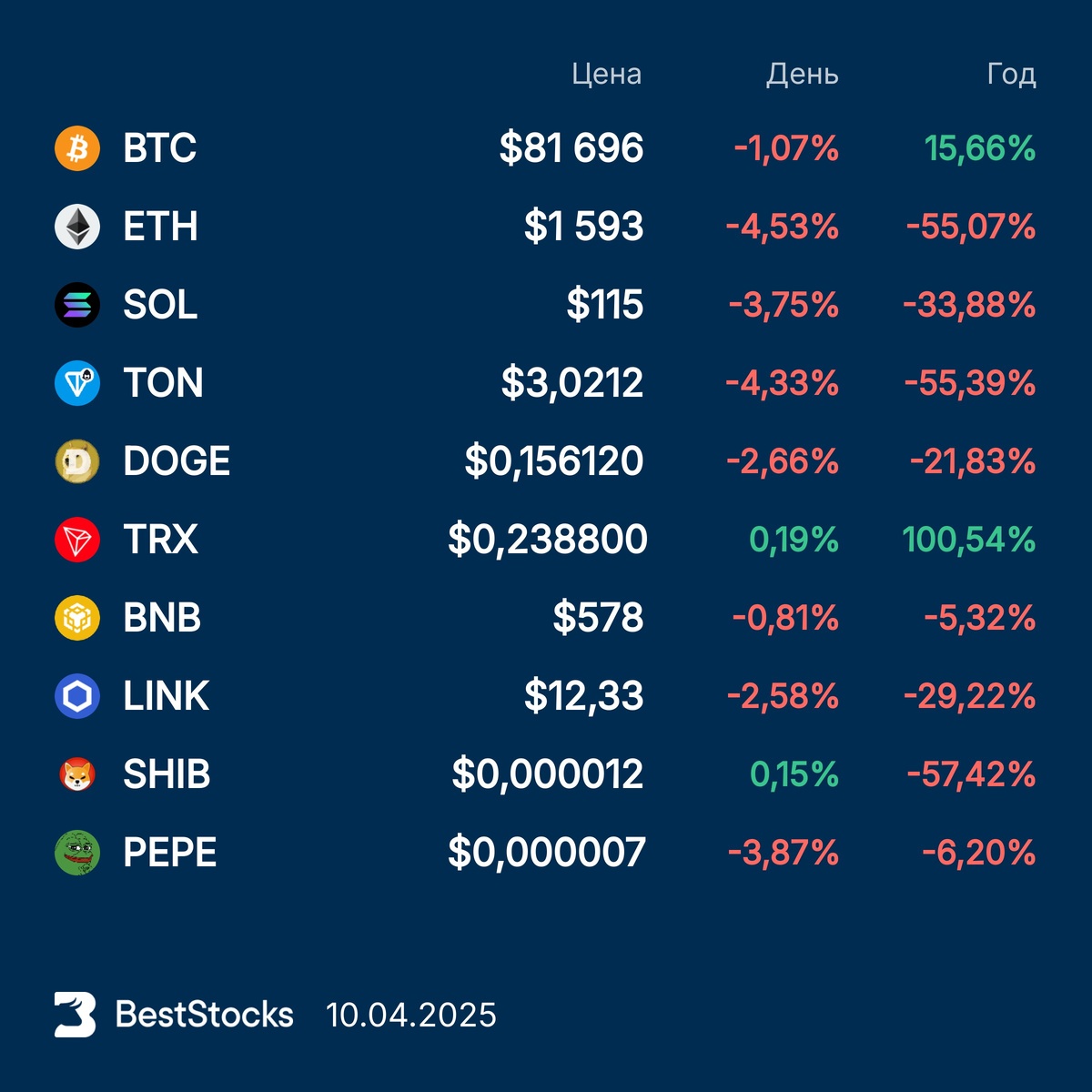 Курсы основных криптовалют: Bitcoin, Etherium, Solana, Toncoin, Dogecoin, TRON, BNB, Chainlink, Pepe, Shiba Inu на текущий момент