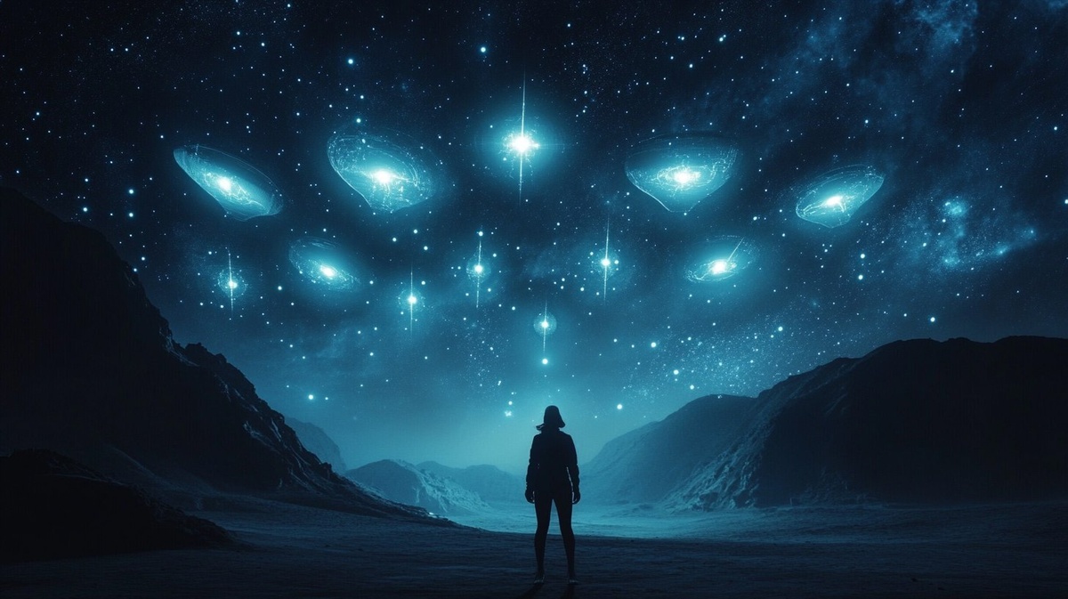 Создано на основе запроса: alien starships flickering to life using human music, signal lights forming patterns in space, eerie yet hopeful