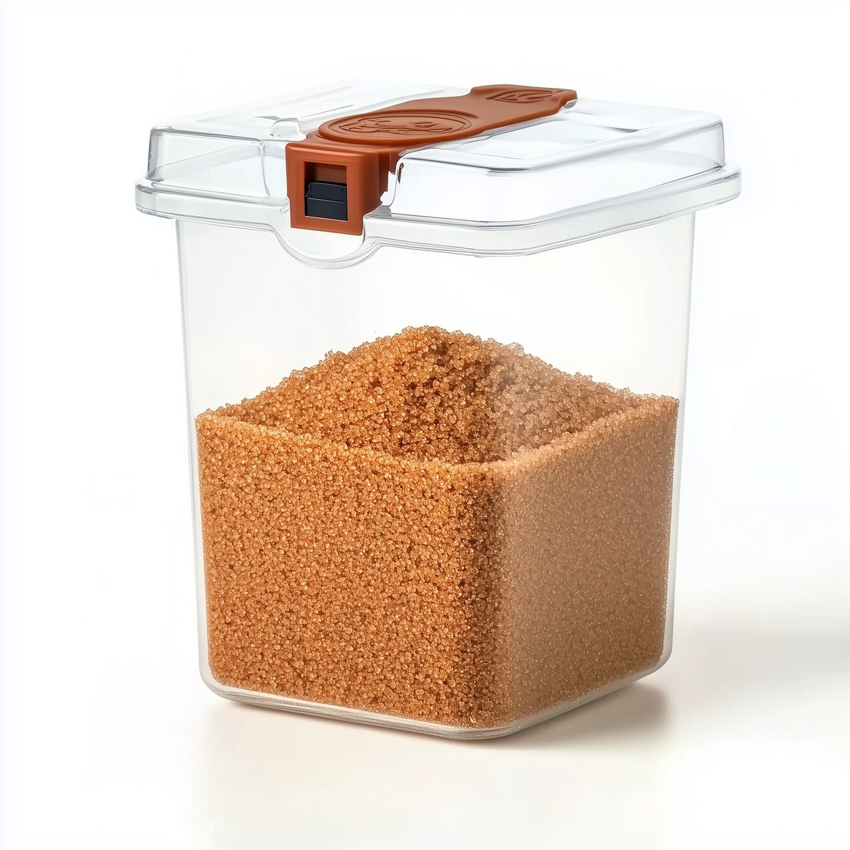 Создано на основе запроса: Real shot, pure white background, there is a square plastic storage jar placed at a 45° angle on the side, filled