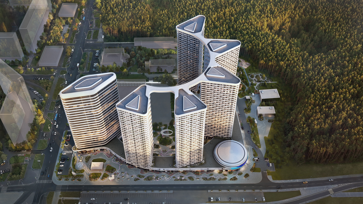 Архитектурная стилистика комплекса очень яркая, как в Сингапуре или Дубае: пять высоток, имеющих форму треугольной призмы, выстроены полукругом и соединены скай-мостами на уровне карниза. Если посмотреть сверху, то комплекс походит на часть шестерни.