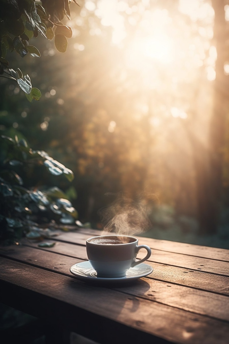 Создано на основе запроса: A steaming cup of coffee on a wooden table, on a sunlit terrace in the morning, soft golden sunlight streaming
