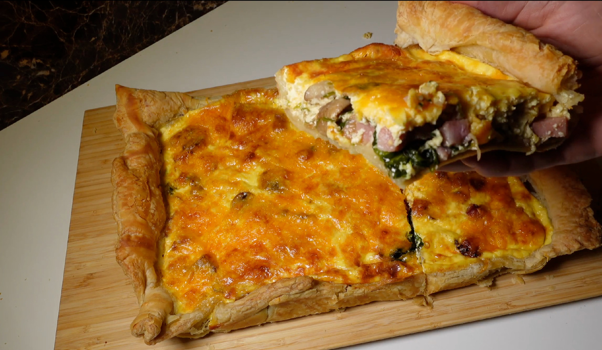 ПРОСТОЙ ПИРОГ - КИШ на слоеном тесте! вкусный рецепт Ингредиенты: 500 г. слоёное тесто бездрожжевое 75 г. шпинат свежий 150 г. сыр чеддер 5 яиц 3 зуб. чеснока 200 г. шампиньонов 300 г. ветчины 100 г. лука 300 мл. сливок 20% Приготовление: 1. Для начала нарезаем кубиком ветчину, слайсами грибы, полукольцами лук, измельчаем чеснок и затем отправляем в разогретую с растительным маслом сковороду лук, затем добавляем грибы, затем добавляем ветчину и чеснок, затем шпинат и в конце солим и перчим по вкусу - начинка почти готова; 2. Тесто раскатываем и соединяем со вторым листом(если одного не хватило), перекладываем его на пекарскую бумагу и отправляем в форму, формируем бортики и отправляем внутрь начинку; 3. В яйца добавляем сливки и взбиваем венчиком(можно чуть-чуть подсолить) и заливаем начинку, сверху посыпаем натертым сыром и отправляем в разогретую до 180 °С духовку на 40-50 минут (у меня была 48 минут); 4. Достаём и даём остыть. И ВСЁ! НАШ ПРОСТОЙ ПИРОГ - КИШ на слоеном тесте ГОТОВ! П