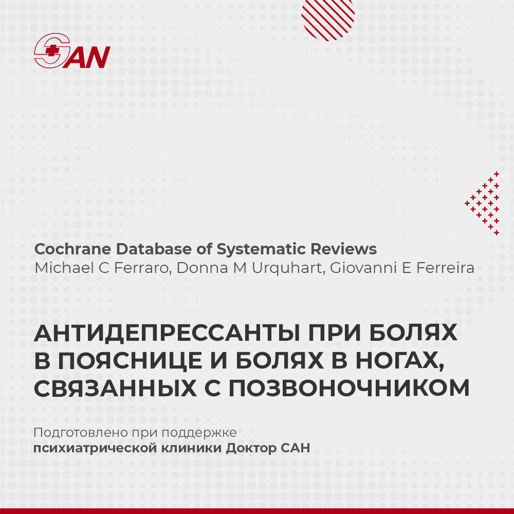 Систематический обзор, опубликованный в Cochrane Database of Systematic Reviews, оценил эффективность и безопасность антидепрессантов при лечении неспецифической боли в пояснице и связанных с позвоночником болей в ногах. Ингибиторы обратного захвата серотонина и норадреналина (ИОЗСН) демонстрируют небольшое снижение интенсивности боли и незначительное улучшение функционального состояния при неспецифической боли в пояснице, но их применение сопряжено с повышенным риском побочных эффектов. Трициклические антидепрессанты (ТЦА) не показали убедительного снижения боли, но могут незначительно уменьшать степень инвалидизации. Что касается селективных ингибиторов обратного захвата серотонина (СИОЗС), то данные об их эффективности остаются ограниченными и малодостоверными. Влияние антидепрессантов на боли в ногах, связанные с патологией позвоночника, пока остаётся неясным, однако ИОЗСН и ТЦА могут представлять интерес для дальнейших исследований. Источник: https://pubmed.ncbi.nlm.nih.gov/400587