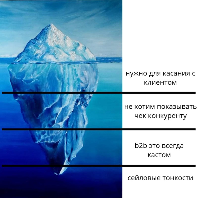 Открытый чек в b2b вреден для денег Есть публичный, честный, обоснованный и настоящий ответы Ответ публичный: закрытый чек это лидогенерация. Клиент должен оставить свой контакт. С ним свяжется сейл, уточнить потребности, занесет в CRM, добавит в рассылку. Клиент, который сам оставил свои контакты всегда лучше холодных клиентов Ответ честный: мы не хотим, чтобы конкуренты знали наши цены. Хотели бы знать их цены, но свои не покажем. Ответ обоснованный: в b2b тьма кастома. И цена может сильно меняться от контекста клиента. Эти изменения не линейны и оцениваются экспертно. Поэтому чек не может быть открытым Настоящий ответ: цену определяет сейл и ему нужна гибкость в управлении чеком. Есть цена, ниже которой сейлу падать нельзя. А все, что выше - заработанное. Сейл может понимать, что у клиента много денег и у компании он возьмет только 1 продукт, флагманский. Тут один ценник. А может быть такое, что клиент перспективный и нужно что-то предложить для затравочки - другой ценник. В эт