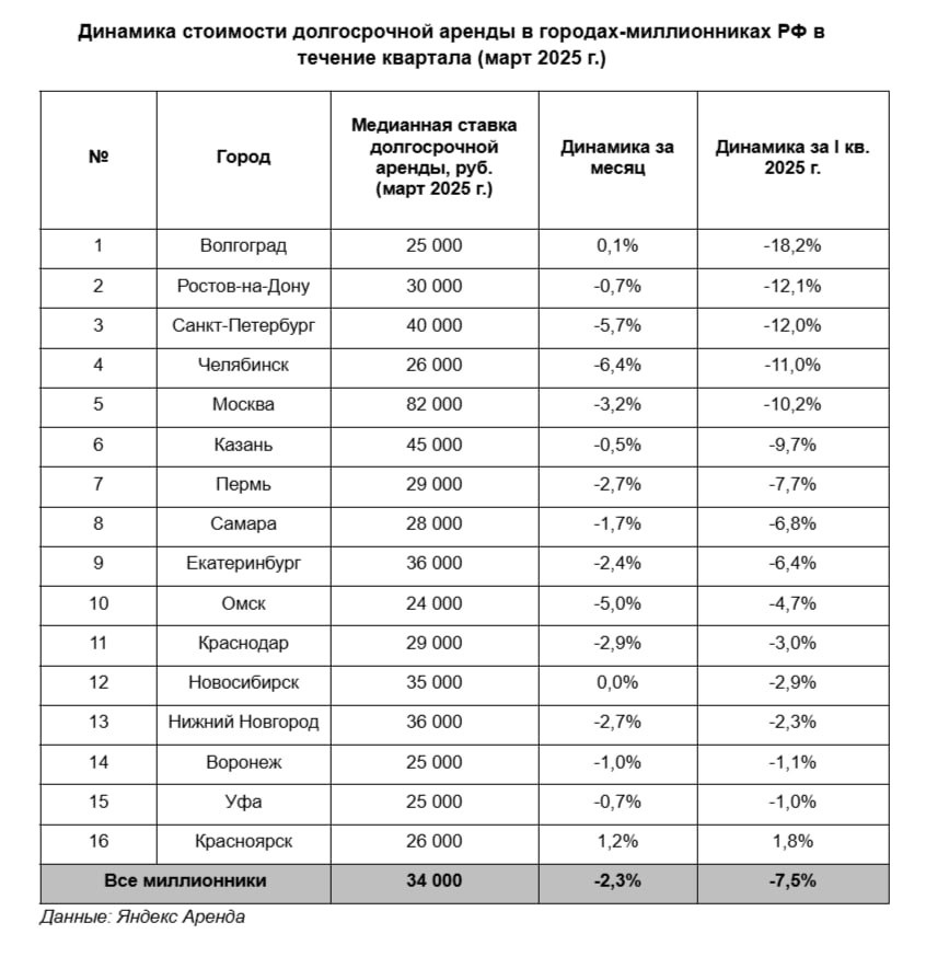 За l квартал 2025 года стоимость долгосрочной аренды в 15 из 16 городов-миллионников снизилась в среднем на 7,5%. • В Москве аренда подешевела на 10,2% — до 82 тыс. руб., • В Петербурге — на 12%, до 40 тыс. руб. Причина — взрывной рост предложения. Только за март число сдающихся квартир увеличилось на 4,2%, а по сравнению с концом 2024 года — почти на треть.