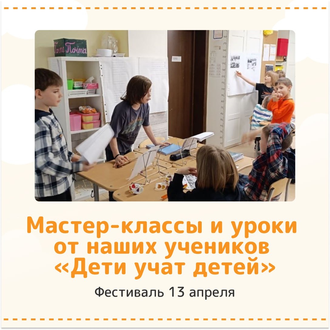 ✏️✏️✏️✏️✏️✏️✏️✏️✏️✏️ Когда дети учат детей — рождается настоящее волшебство☀️ В нашей школе происходит что-то удивительное. Периодически ребята сами становятся учителями — и это не про формальные доклады, а про искренний огонь в глазах. И после объяснения темы младшим, успеваемость «учителей» по предмету растет📈 🧐Ребята говорят: «Если завтра мне нужно объяснить это другим — я сам должен разобраться досконально». Дети говорят на одном языке и уважают друг друга. Когда дети объясняют детям, происходит магия настоящего понимания и ситуация лидерства и успеха для ребят, которые учат. Мы регулярно практикуем этот прием и приглашаем и вас поучаствовать и посмотреть как это эффективно в рамках Фестиваля 13 апреля. Мастер-классы и уроки для школьников «Дети учат детей» 🔹11.15 Темы уточняются 🔹13.10 Изо, макраме 🔹13.10 Урок от наших второклассников 🔹13.10 Урок по технологии запоминания исторических дат от 6 класса 🔹14.15 Изо и мастер-класс «Кошелек из бумаги» 🔹14.15 Мастер-класс «Фл