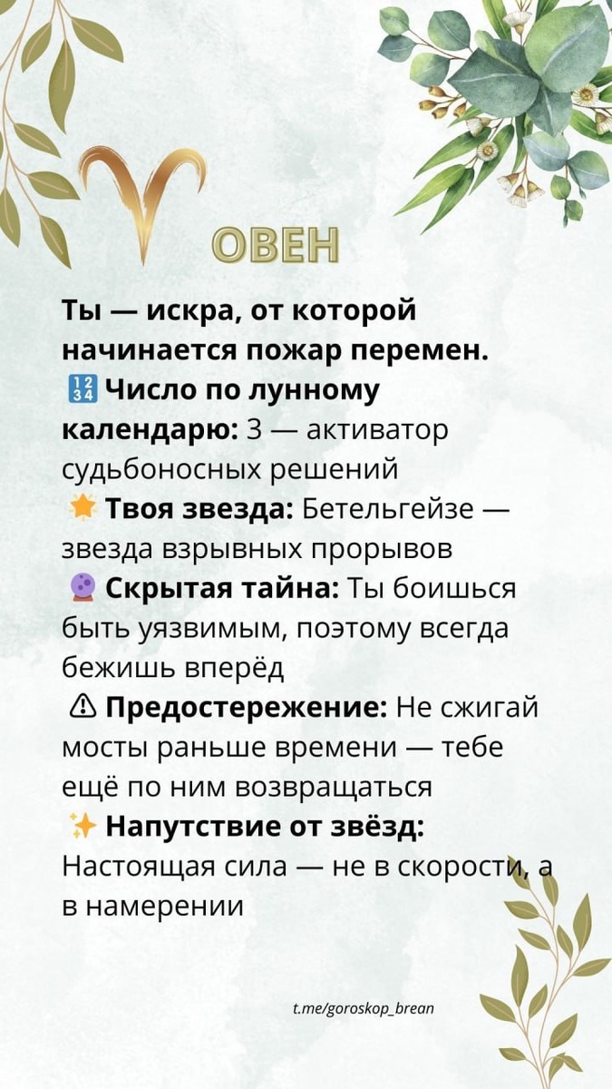 🌐Судьба в одной строчке» - таинственный гороскоп, раскрывающий твою суть в одном дыхании, а затем — открывающий завесу глубин 💖 📲 Полные детали и советы — в Telegram 👉 t.me/goroskop_brean | Поделись с Другом 🙏