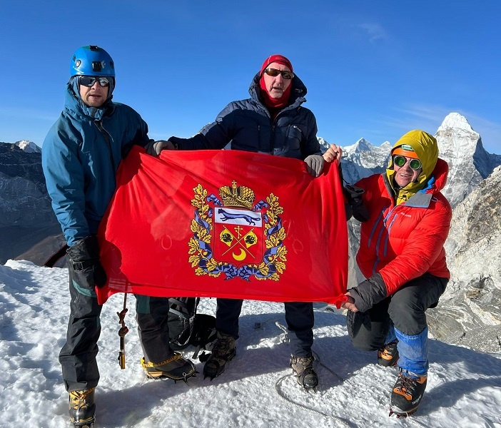 Итак, команда Оренбуржья после 8-часового ночного штурма к утру поднялась на вершину Айленд пик 6168 метров и развернула флаг Оренбургской области. Я честно заранее об этом даже друзьям не говорил, так как мы сами не были уверены в успешном восхождении. На гору ночью взбиралась вереница ночных фонариков, но на рассвете половина осталась или на половине горы или не смогла преодолеть ледовые стены на «кошках» и на жумарах.