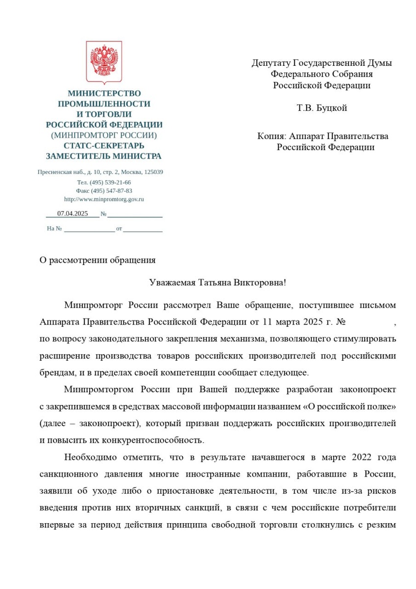 ⚡️Минпромторг, Минфин и Роспотребнадзор поддержали законопроект «О российской полке» Это следует из письма Минпромторга РФ, которое пришло в ответ на мое обращение к первому зампреду Правительства России Денису Мантурову. Ждем поддержку ФАС и Минэкономразвития. Напомню слова Президента РФ Владимира Путина: «Либо Россия будет суверенной, либо её не будет».
