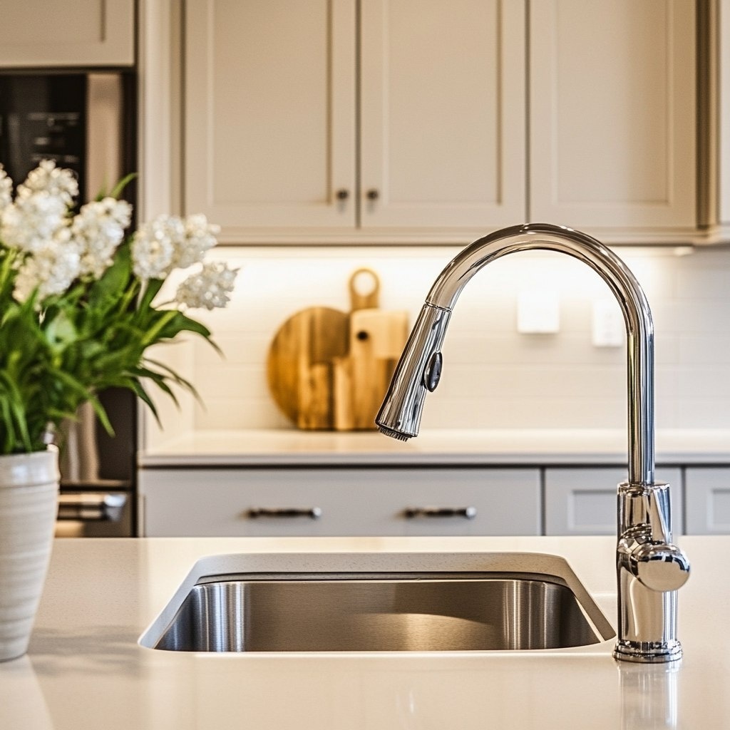 Создано на основе запроса: Generate a picture showing a kitchen with a sink and cabinets as the background. The overall tone is simple. The sink is silver stainless steel and the overall picture is large. The background cabinets are off-white in color.