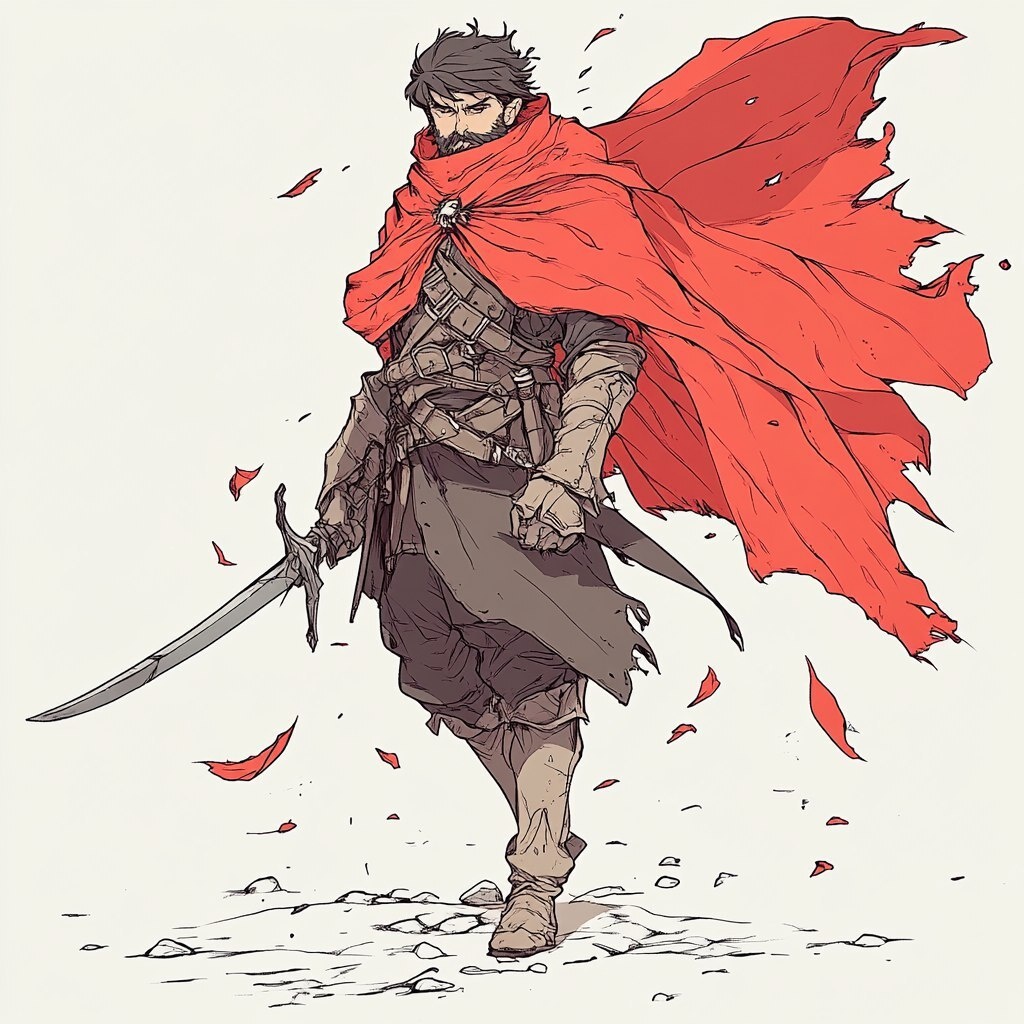 Создано на основе запроса: Fantasy concept illustration, Male, Human, Battle Mage, Powerfull, Heavy leather armour, Two-handed sword, Scarlet red cloak, Octopath traveler style, White background, High quality, Exaggerated fighting pose