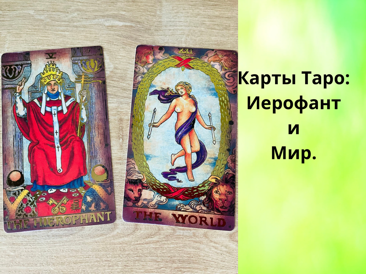 Это Иерофант. Второй – спокойный, наполненный гармонией и ощущением завершенности. Он словно говорит: «Все идет как надо, расслабься». Это Мир.