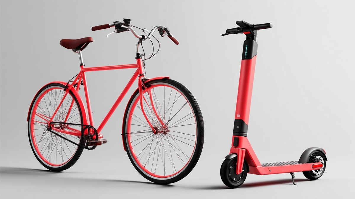 Создано на основе запроса: Bicycle and electric scooter in red colors on a white background, a picture that encourages you to come in and
