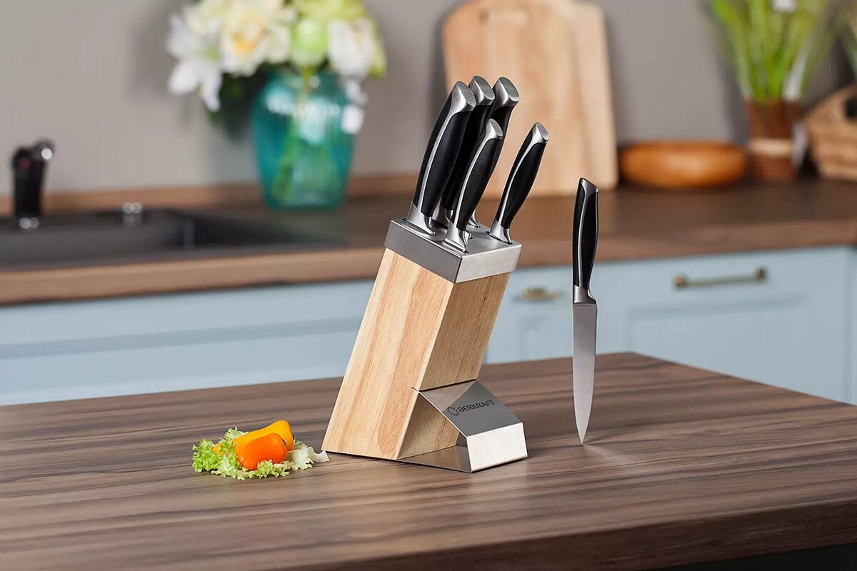 Набор поставляется с блоком, в котором можно безопасно хранить ножи. Блок создан из прочного материала, имеет стильный дизайн и позволяет легко получить доступ к нужному ножу.