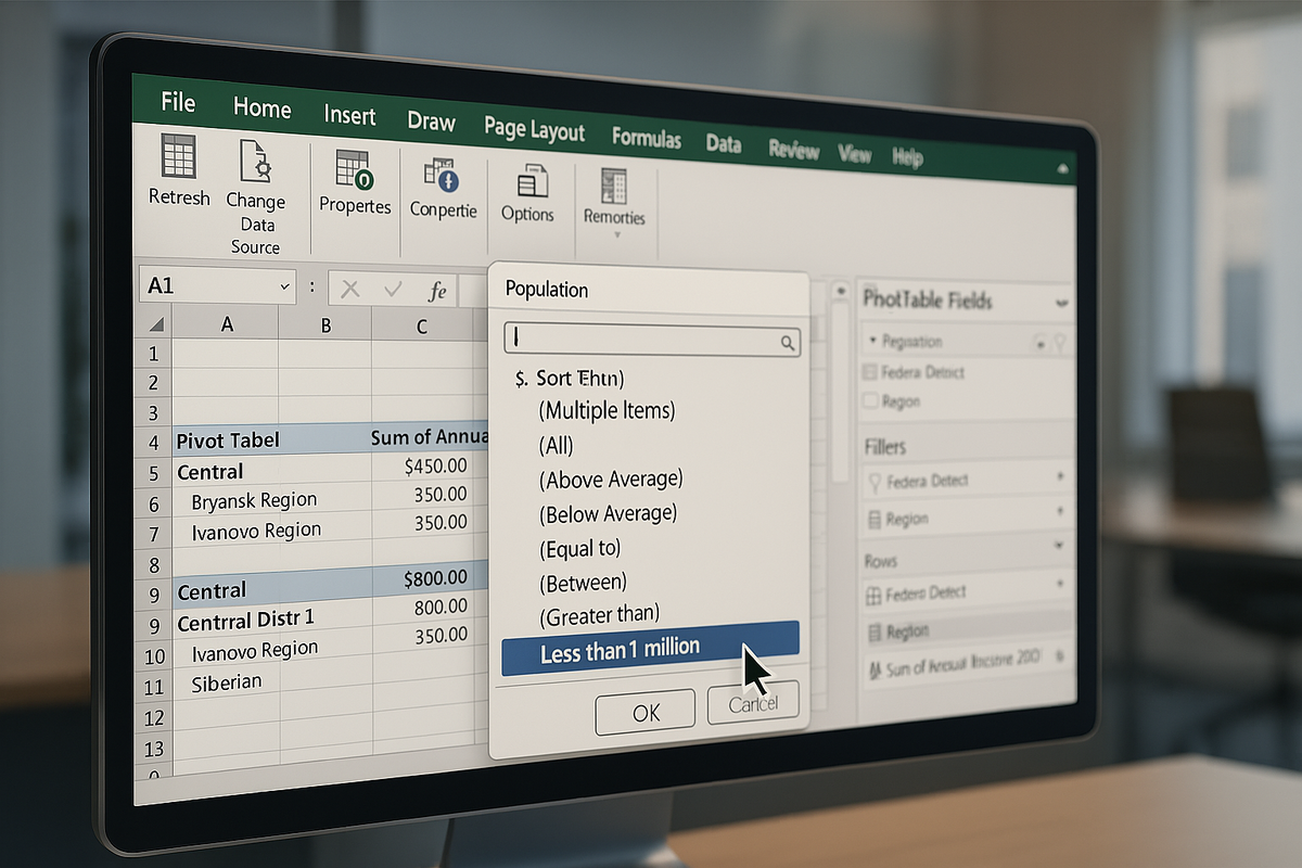 Фильтрация в сводной таблице позволяет сосредоточиться только на нужной информации. Вы можете временно скрыть лишние строки и отображать только те данные, которые соответствуют определённым критериям — например, регионы с численностью менее одного миллиона.