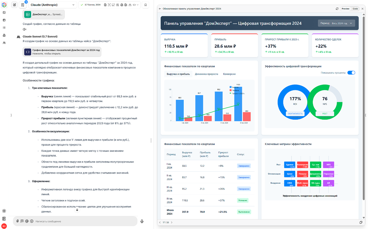 Важной составляющей любых отчетов и презентаций являются графики и визуализация данных. Мы решили проверить как справятся с этой задачей три нейросети: Claude, DeepSeek, ChatGPT. Для примера взяли данные агентства недвижимости “ДомЭксперт” 🏠 Легенда: Агентство недвижимости "ДомЭксперт" работает на рынке более 10 лет, специализируясь на продаже и аренде жилой недвижимости в крупном региональном центре и пригородах. К началу 2024 года компания столкнулась с замедлением роста и усилением конкуренции со стороны более технологичных игроков рынка. Руководство решило инвестировать в цифровую трансформацию бизнеса, чтобы повысить эффективность работы агентов и улучшить клиентский опыт. Исходные данные финансовых результатов по кварталам 2024 г. представлены на скрине. ⬇️Используемый промпт: "Создай график, согласно данным из таблицы". Протестировав все три нейросети, мы получили разные графики (результаты представили на скринах). Claude 3.7 представил целый дашборд со сводными данными, которы