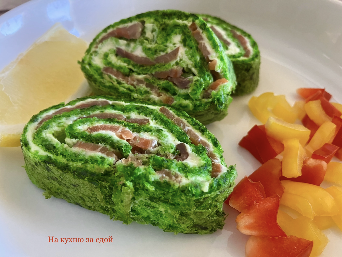 Основа рулета мягкий овощной бисквит со шпинатом. Начинка из творожного сыра, пасты из слабосолёного синекорого палтуса и кусочками дальневосточного лосося.
