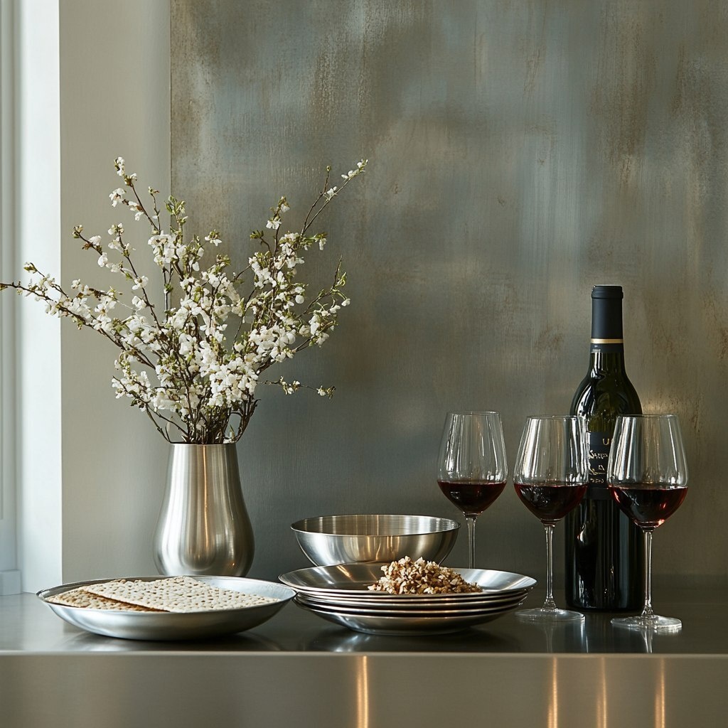 Создано на основе запроса: a modern and elegant atmosphere. On the aluminum surface, arrange symbolic items like matzah, wine cups, spring flowers, and a small Seder plate. The mood should feel festive, clean, and reflective of renewal and freedom, with a touch of sophistication and minimalism. The aluminum adds a contemporary, industrial touch to the traditional holiday symbols." --- Автоперевод: современная и элегантная атмосфера. Хорошо выглядит? 🤔 https://dzen.ru/id/65c0c65c86e4f837c27b24d7 #ИИ #AI #нейросеть #midjourney #art