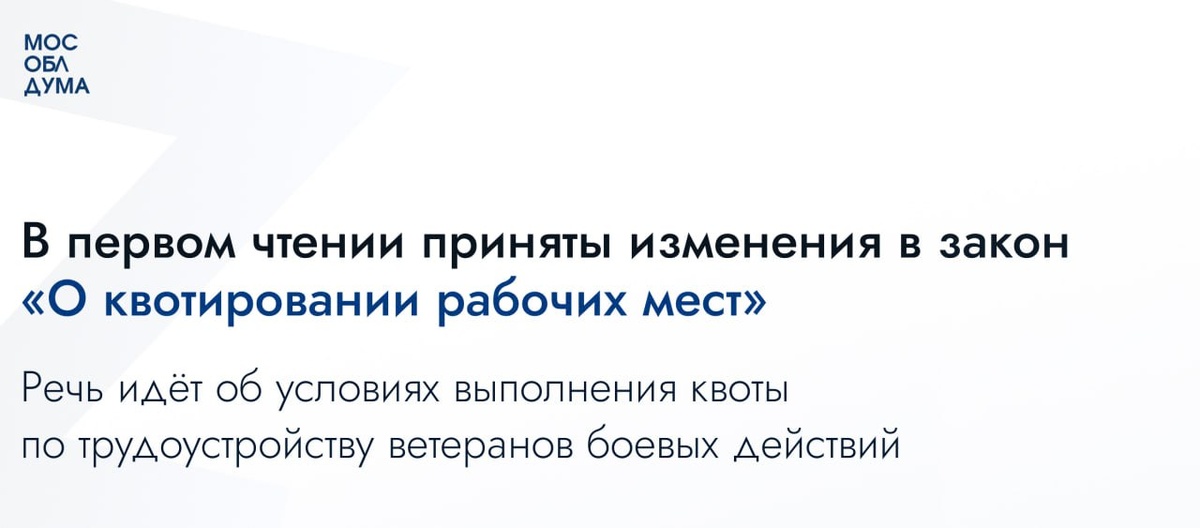 ⚡️Мособлдума приняла в первом чтении законопроект об обязательном трудоустройстве ветеранов боевых действий в рамках квотирования рабочих мест Планируется, что распространяться нововведения будут на работодателей с численностью работников больше 200 человек. «Помощь с трудоустройством воинам, вернувшимся из зоны спецоперации, – одна из задач, которые ставит перед нами Президент. И в Подмосковье мы стараемся данное поручение выполнять. У нас, например, запущена кадровая региональная программа «Герои Подмосковья» – для тех воинов, которые хотят попробовать себя в органах государственной и муниципальной власти, госкомпаниях. Но мы видим, что параллельно нужно делать упор на востребованные рабочие специальности, чтобы ветераны спецоперации могли получить необходимые знания и пойти на работу на предприятие. Так они выйдут в коллектив, будут вносить свой вклад в общее дело – это новые навыки, стабильная оплата труда и уверенность в завтрашнем дне. Новая законодательная инициатива как раз б