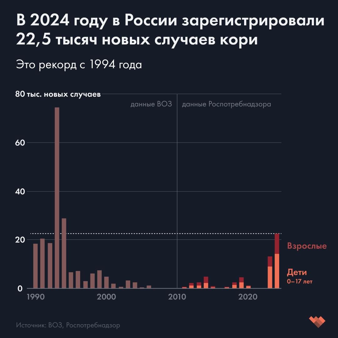 Из 22,5 тысячи новых случаев 2/3 приходится на детей — вероятно, их не вакцинируют В 2024 году в России зарегистрировали 22,5 тысячи новых случаев кори — из них 14 тысяч у детей до 17 лет включительно. Для сравнения: в 2023-м было всего 13 тысяч заболевших и из них 8,8 тысячи детей. Это следует из данных Роспотребнадзора. В абсолютных значениях самый большой прирост в четырех регионах. Это Москва (2,8 тысячи), Ростовская и Московские области (по 1,3 и 1,2 тысячи), а еще Красноярский край (тысяча). В этих же регионах большинство новых случаев приходится на детей — 57% (2,9 тысячи детей), 71% (1,2 тысячи), 57% (тысяча) и 58% (660) соответственно. Руководитель АНО «Коллективный иммунитет» Антонина Обласова отмечает, что важно рассмотреть все возможные причины, почему в этих регионах особенно высокие показатели в сравнении с другими. Возможно, есть какие-то факторы, которые действительно привели к большей заболеваемости, а возможно, эти регионы лучше других ведут учет заболевших. ◾️ В Росс