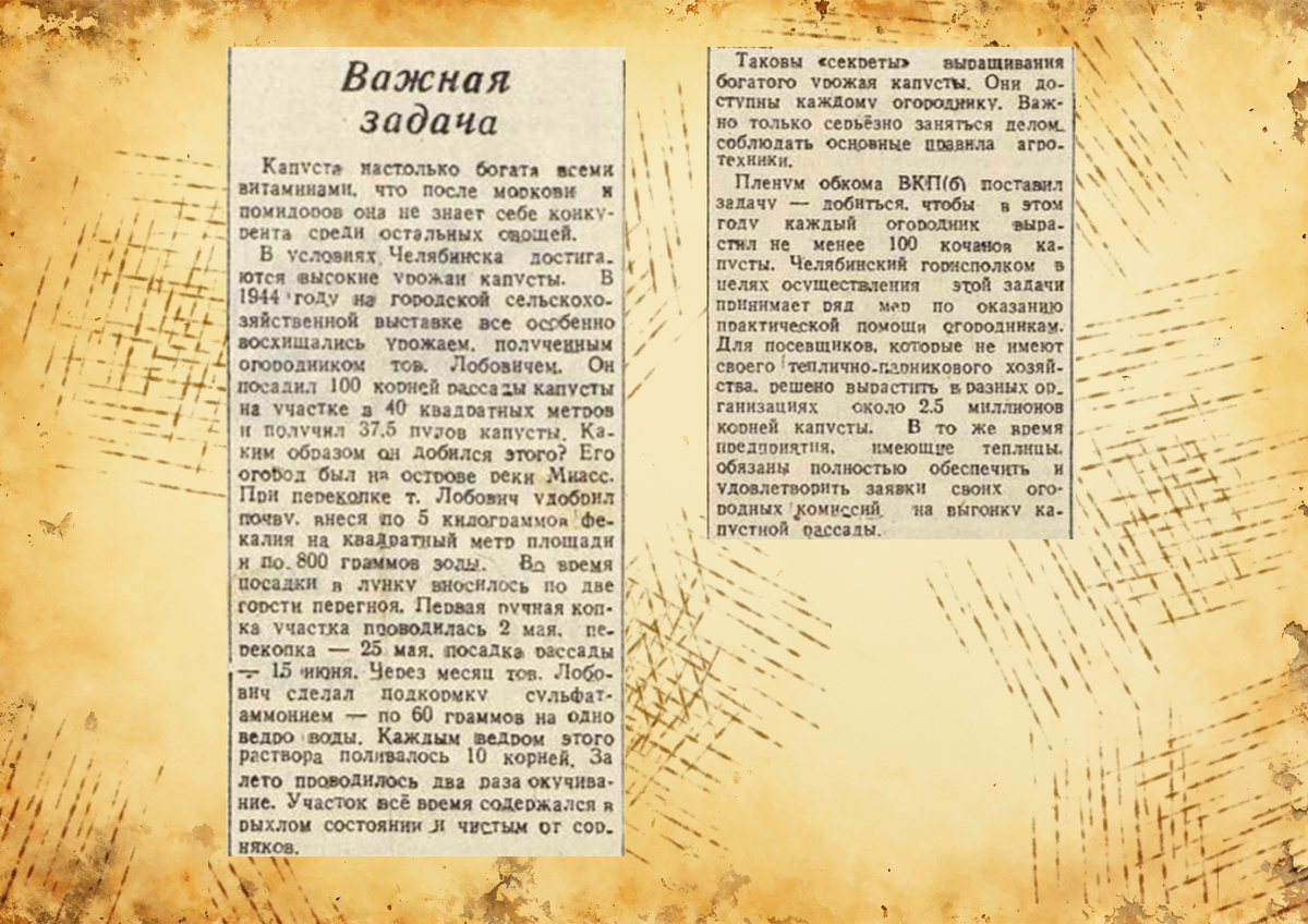 Капуста настолько богата всеми витаминами, что после моркови и помидоров она не знает себе конкурента среди остальных овощей. В условиях Челябинска достигаются высокие урожаи капусты. В 1944 году на городской сельскохозяйственной выставке все особенно восхищались урожаем, полученным огородником тов. Лобовичем. Он посадил 100 корней рассады капусты на участке в 40 квадратных метров и получил 37,5 пудов капусты. Каким образом он добился этого? Его огород был на острове реки Миасс. При перекопке т. Лобович удобрил почву, внеся по 5 килограммов фекалия на квадратный метр площади и по 800 граммов золы. Во время посадки в лунку вносилось по две горсти перегноя. Первая ручная копка участка проводилась 2 мая, перекопка — 25 мая, посадка рассады — 15 июня. Через месяц тов. Лобович сделал подкормку сульфат-аммонием — по 60 граммов на одно ведро воды. Каждым ведром этого раствора поливалось 10 корней. За лето проводилось два раза окучивание. Участок все время содержался в рыхлом состоянии и чисты