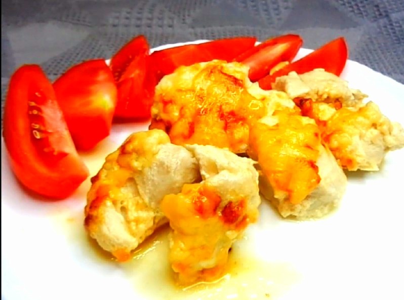 - Куриное филе переложить в глубокую миску, добавить соль по вкусу, кефир, чеснок (пропускаем через пресс или трём на мелкой терке)и половину натёртого сыра.