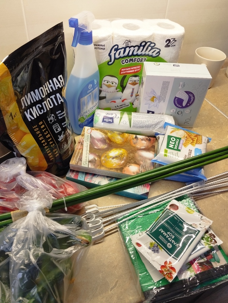 Несколько дней я пряталась дома от зимнего ветра и снега. Сегодня все еще холодно, но уже посветлее и временами показывается солнышко. Я решила прогуляться до торгового центра и зайти в Фикспрайс. Купила всего по мелочи, бумажные полотенца, ватные диски, предметы гигиены, жидкость для окон, красители для яиц. Еще немного удобрений, колышки 120см и белые крючки, из которых получаются подставки под ягоды. Увидела 1кг лимонной кислоты, тоже взяла. И по пути зашла в овощной киоск за помидорами и огурцами. Колышки я уже разрезала пополам, получилось 6 колышков по 60см, как раз для 6 моих помидорок черри. Еще купила зеленый коврик для пересадки растений, чтобы земля не разлеталась по всему столу. Лимонную кислоту кладу в автоклав по одной столовой ложке, защищает от накипи. Периодически прогоняю стиральную машину, чтобы очистить. Такой большой объем еще никогда не покупала. Теперь точно знаю, что мне не нужно о ней беспокоиться долгое время. После магазина зашла в Валдберрис забрать заказ.