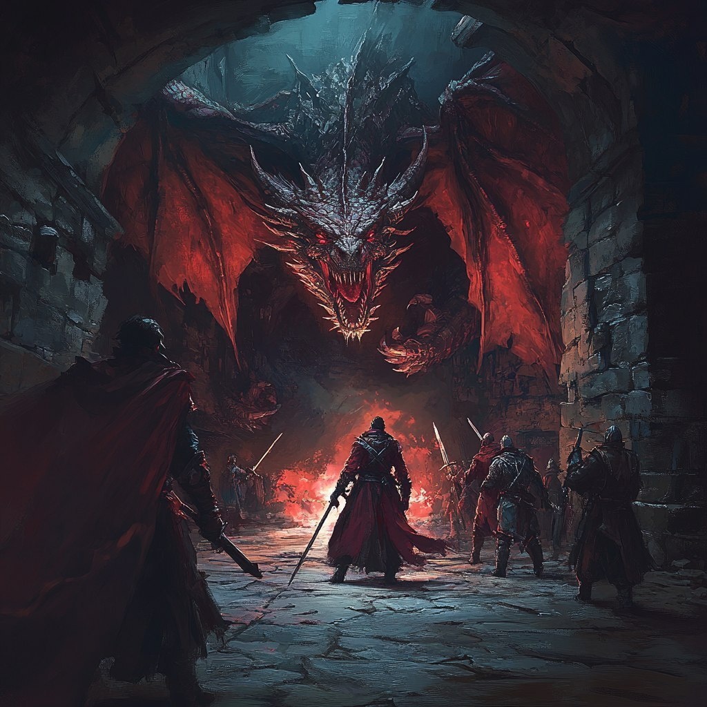 Создано на основе запроса: A realistic RPG game screen. A perspective from behind the hero and his party. They are facing a dragon deep in a dark and desolate dungeon. --- Автоперевод: Реалистичный экран игры RPG. Красиво получилось? 🤔 https://dzen.ru/id/65c0c65c86e4f837c27b24d7 #ИИ #AI #нейросеть #midjourney #art