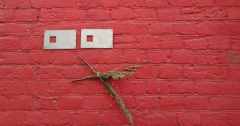 После установки табличек двое участников церемонии решили пройтись по нескольким адресам и проверить, не сорвали ли там знаки. «Так вышло, что я могу иногда посвятить этому два-три часа. Составляю список адресов и иду по ним смотреть, висят ли таблички, — рассказала мне Наталья. — Если где-то их нет, печатаем копии, ламинируем, потом вешаем. Вешаем, чтобы через три дня их снова сорвали и все повторилось. Это такой конвейер. Но это моя личная инициатива, я готова тратить на это время».