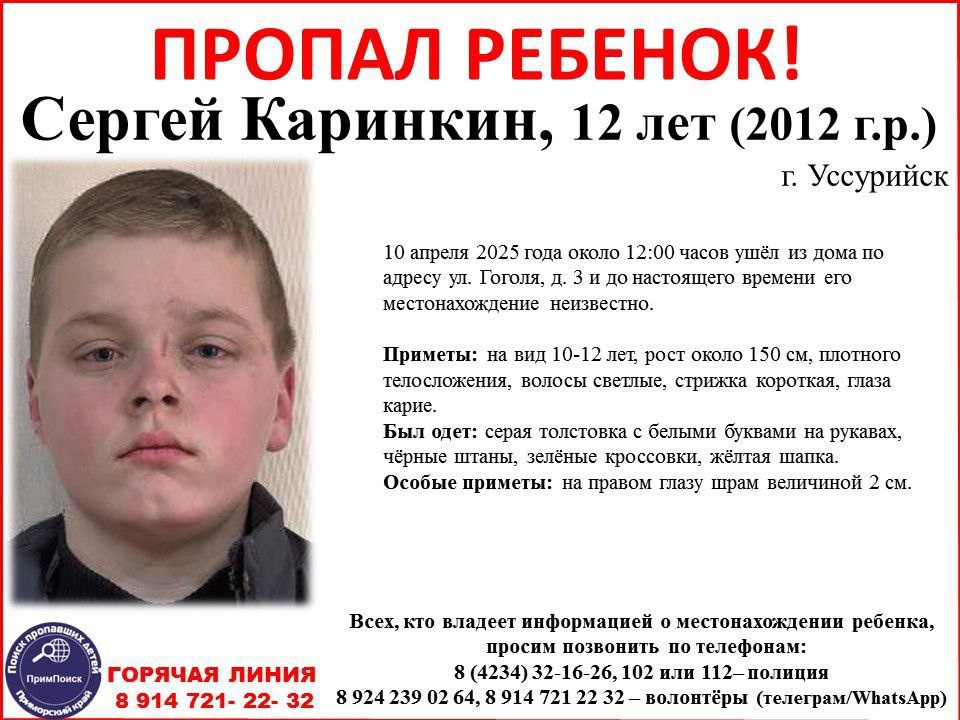 ВНИМАНИЕ! ПРОПАЛ РЕБЕНОК! Сергей Каринкин, 12 лет (2012 г.р.) г. Уссурийск 10 апреля 2025 года около 12:00 часов ушёл из дома по адресу ул. Гоголя, д. 3 и до настоящего времени его местонахождение неизвестно. Приметы: на вид 10-12 лет, рост около 150 см, плотного телосложения, волосы светлые, стрижка короткая, глаза карие. Был одет: серая толстовка с белыми буквами на рукавах, чёрные штаны, зелёные кроссовки, жёлтая шапка. Особые приметы: на правом глазу шрам величиной 2 см. Всех, кто владеет информацией о местонахождении ребенка, просим позвонить по телефонам: 8 (4234) 32-16-26, 102 или 112– полиция 8 924 239 02 64, 8 914 721 22 32 – волонтёры (телеграм/WhatsApp) #поиск_Каринкин Барахолка: @uss_baraholka Подписка: @Mark2_chee