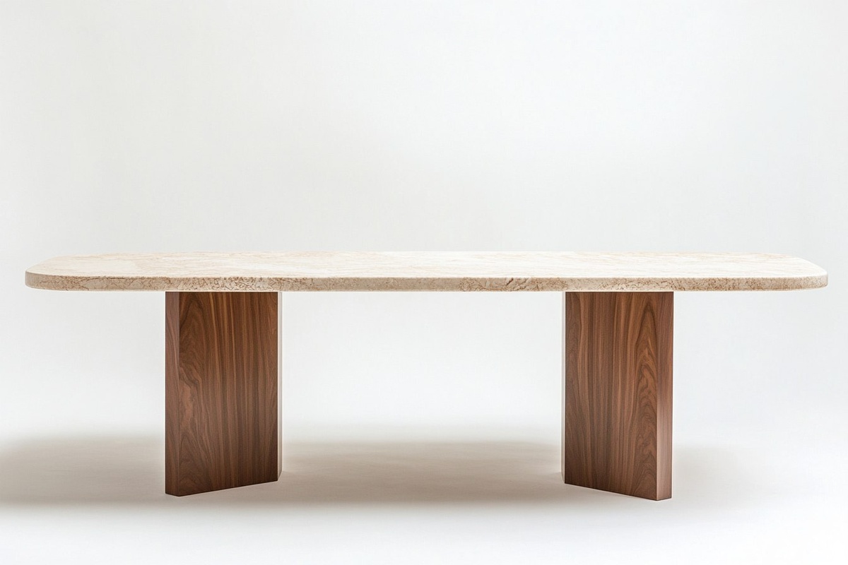 Создано на основе запроса: long beige polished stone rectangular dining table with 2 flat plate legs on opposite sides made of laquered