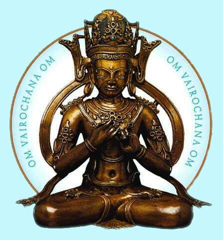 Будда Вайрочана. Имя Вайрочана означает «Тот, кто подобен солнцу» или «Излучающий свет». Вайрочана представляет как единство, так и исток Дхиани Будд. Его мудрость – это мудрость Дхармадхату. Дхармадхату – это царство Истины, в котором всё таково, каким является на самом деле. Мудрость Вайрочаны также называют Всеохватывающей Мудростью Дхармакаи. Дхармакая – это Тело Закона, или совершенная природа Будды. Трансцендентная мудрость Вайрочаны открывает сферу высшей реальности и нейтрализует яд невежества, или заблуждения. Его мудрость считается источником или итогом всей мудрости Дхиани Будд. Его эмблемой является дхармачакра – колесо Учения, или колесо Закона. Таково определение учения Будды. Его восемь спиц представляют собой Благородный Восьмеричный Путь, который Гаутама провозгласил в своей проповеди по достижении просветления. Мудрой Вайрочаны является мудра дхармачакры, жест вращения колеса Учения. Поскольку он воплощает мудрость всех Будд, биджа Вайрочаны есть универсальный звук ОМ