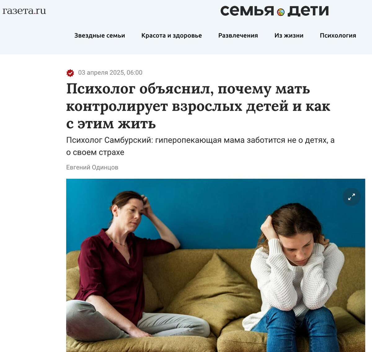 ГАЗЕТА.РУ Гиперопека — это не любовь, а страшная ловушка, замаскированная под заботу. В психологии даже есть специальный термин — «инфантилизация». Это когда вам уже давно за тридцать, а мама все еще ежедневно спрашивает: «Ты поел? Шапку надел?» Или дочь уже имеет троих детей, но ее мама продолжает решать, какую одежду носить и как воспитывать внуков, рассказал «Газете.Ru» психолог Станислав Самбурский. https://www.gazeta.ru/family/news/2025/04/03/25463120.shtml