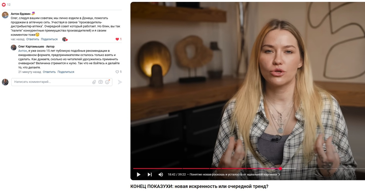 Напомню, что, несмотря на мою приверженность к индивидуальному сопровождению бизнес-проектов для компаний малого бизнеса, я достаточно давно веду группы наставничества в самых разных форматах – это и группы в Малом Бизнесе Москвы, это и консультации в Корпорации МСП, это и моя индивидуальная «придумка» в формате «С экспертом обо всех деталях косметического бизнеса». Почему вспомнил? Потому что получил комментарий (на фото слева) от человека, с ним и его женой мы плотно работали как раз в этом уникальном формате. Многое обсуждали, многое тестировали и вот тут такой комментарий. Предпринимательская семья по фамилии Вдовины базируется в Анапе, имеет своё производство, начинали, как и многие, с интернет-торговли через маркетплейсы. Но решили не останавливаться на имеющемся и начать строить реальную дистрибьюторскую компанию. В одном из разговоров я просто посоветовал не гнаться за «успешным успехом», а чаще бывать в полях. Прошло много времени от этого разговора и вдруг такой комментарий о