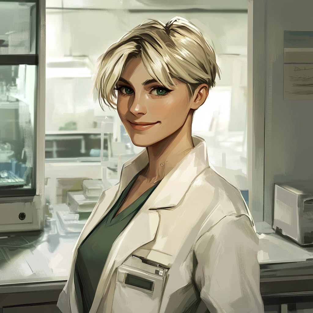 Создано на основе запроса: A woman in her 30s, with boyish-blond cropped hair (with a long white streak) A round, gentle face (neither fat nor thin) Intense green eyes A friendly smile Dressed in an open, white medical examiner's coat. Hand in pocket In a police laboratory --- Автоперевод: Женщина в возрасте 30 лет, с укороченными волосами мальчишеского белого цвета (с длинной белой полосой) круглым, нежным лицом (ни толстым, ни тонким) интенсивными зелеными глазами, дружелюбная улыбка, одетая в открытое белое пальто медицинского экспертиза. Какое твое мнение? 🤔 https://dzen.ru/id/65c0c65c86e4f837c27b24d7 #ИИ #AI #нейросеть #midjourney #art
