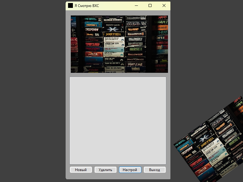 Небольшая программка. Посвященная теме видеокассет формата ВХС. ВХС – это целая вселенная для тебя и меня. Для таких как ты, как говорится. Как здорово иметь увлечения в жизни. Смотреть фильмы на Вхс кассетах. И иметь какую-то специальную программку под это дело. Я тоже так подумал. У меня у самого много кассет. Это программа список. Написана на Визуал Бэйсике. В рамках практике Визуал Бэйсика. Я перехожу к практике. И это правильно! Так и надо делать! Программа умеет добавлять новую кассету или удалять. И все это дело сохраняется в файл. И этот все. Плюс настройки. Самые простые. Выбор языка. И все. Для интереса есть картинка с коллекцией кассет. И это про Вхс кассеты софт. Добавляй. Удаляй кассеты, которые у тебя есть. И веди такой список. Для собственного интереса! Ведь так здорово жить с увлечениями! Вот новая кассета у тебя. Жми новый. И впиши название кассеты. И вот у тебя список обновился! И главное все это записывается в файл. Когда ты снова откроешь программу, то все кассеты б