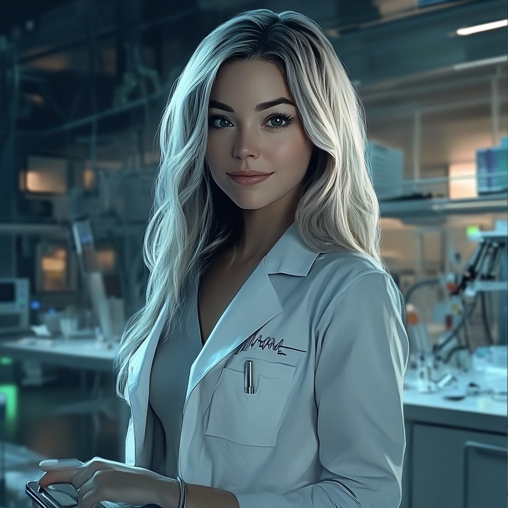 Создано на основе запроса: A woman in her 30s, with medium-length blond hair (with a long white streak) A round, gentle face (neither fat nor thin) Intense green eyes A friendly smile Dressed in an open white medical examiner's coat. Hand in pocket In a police laboratory --- Автоперевод: Женщина в возрасте 30 лет, со светлыми волосами средней длины (с длинной белой полосой) круглым, нежным лицом (ни толстым, ни тонким) интенсивными зелеными глазами, дружелюбная улыбка, одетая в открытое белое пальто медицинского эксперта. Красиво выглядит? 🤔 https://dzen.ru/id/65c0c65c86e4f837c27b24d7 #ИИ #AI #нейросеть #midjourney #art