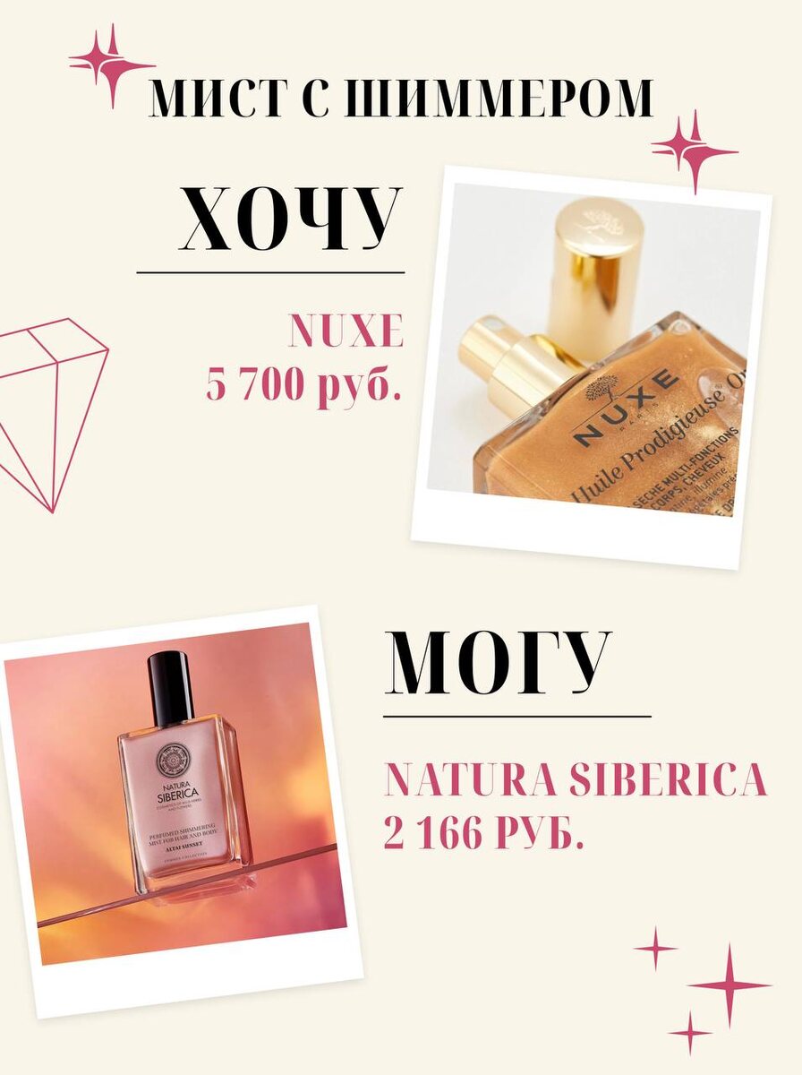 В 1991-м NUXE перевернуло игру: впервые в мире появилось сухое масло — легенда, мультифункциональный эликсир для тела, лица и волос. Без силиконов, с 6 маслами, и с ароматом, от которого хочется жить босиком по лужайке. Но если хочется чего-то полегче — парфюмированный мист от Natura Siberica с шиммером. Сияет, пахнет, увлажняет — и стоит приятно.