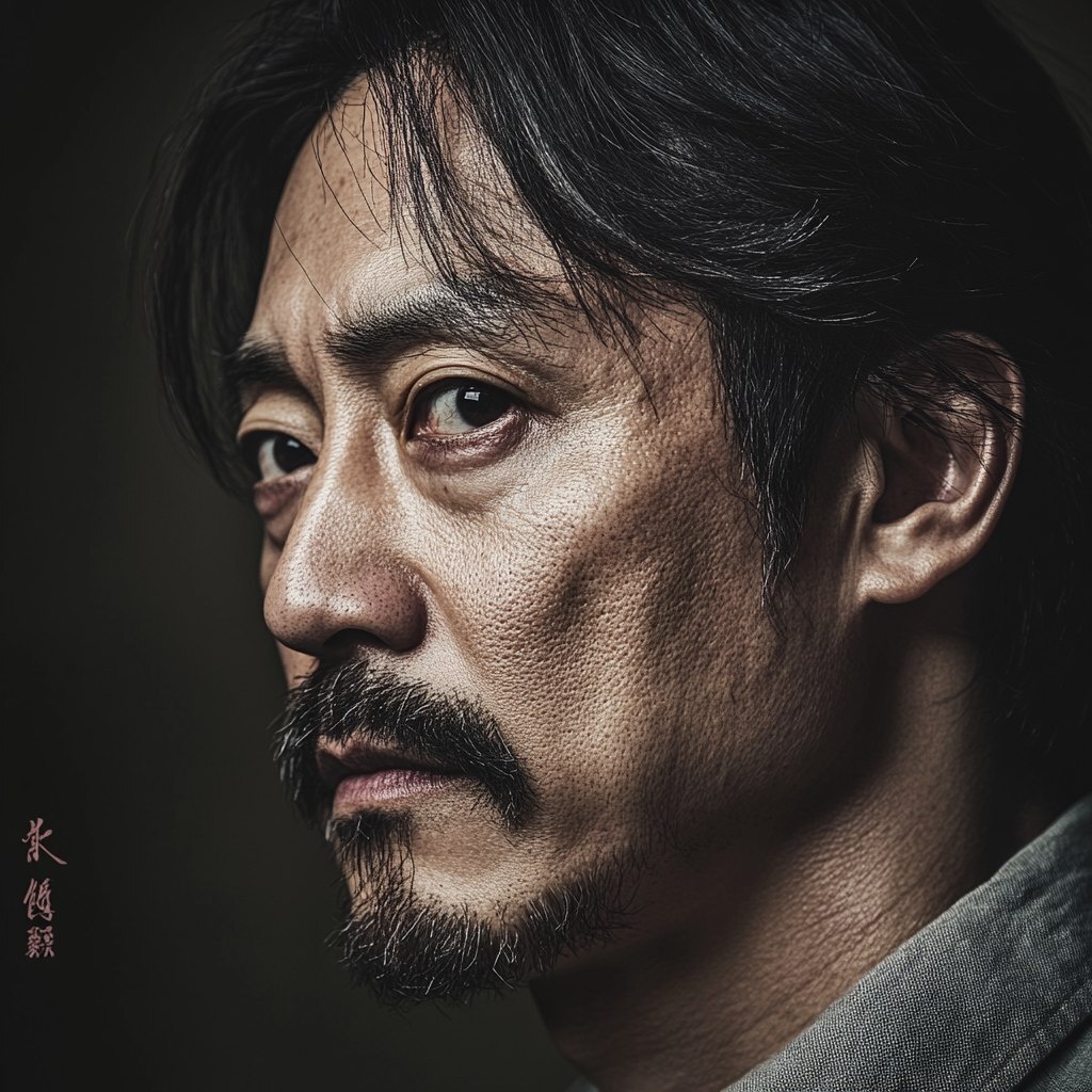 Создано на основе запроса: portrait asian man/one eyes visible/ totally side profile/ realistic /half long hair/45 years old/ natural light