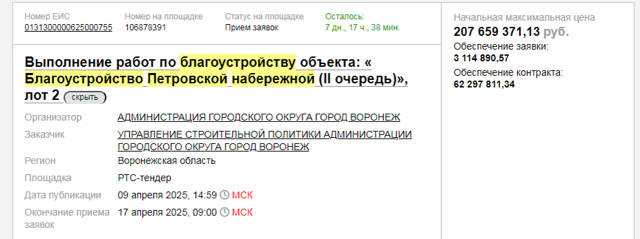 Ему предстоит, как говорится в документации к закупке, до 30 июля 2025 года выполнить на объекте общестроительные работы и благоустройство. скриншот сайта госзакупок В том числе установить малые архитектурные формы, провести озеленение, ограждение и выполнить некоторые виды работ по электроснабжению и водоснабжению, установки сетей связи. скриншот из документов закупки, опубликованной 9 апреля Напомним, работы по благоустройству Петровской набережной (II очередь) выполнялись по заказу мэрии Воронежа компанией АО «ПМК-38» из Кисловодска. Первоначальная стоимость контракта была 1 млрд 188 млн рублей. скриншот сайта госзакупок Это были средства федерального бюджета, областного и бюджета Воронежа. Несмотря на то, что в июне 2023 года еще два участника торгов предложили за эти работы меньшие деньги, мэрия Воронежа подписала контракт с той организацией, которая предложила большие деньги за свои услуги. Никакой экономии бюджетных денег мэрия Воронежа не совершила. Более того, в результате нес