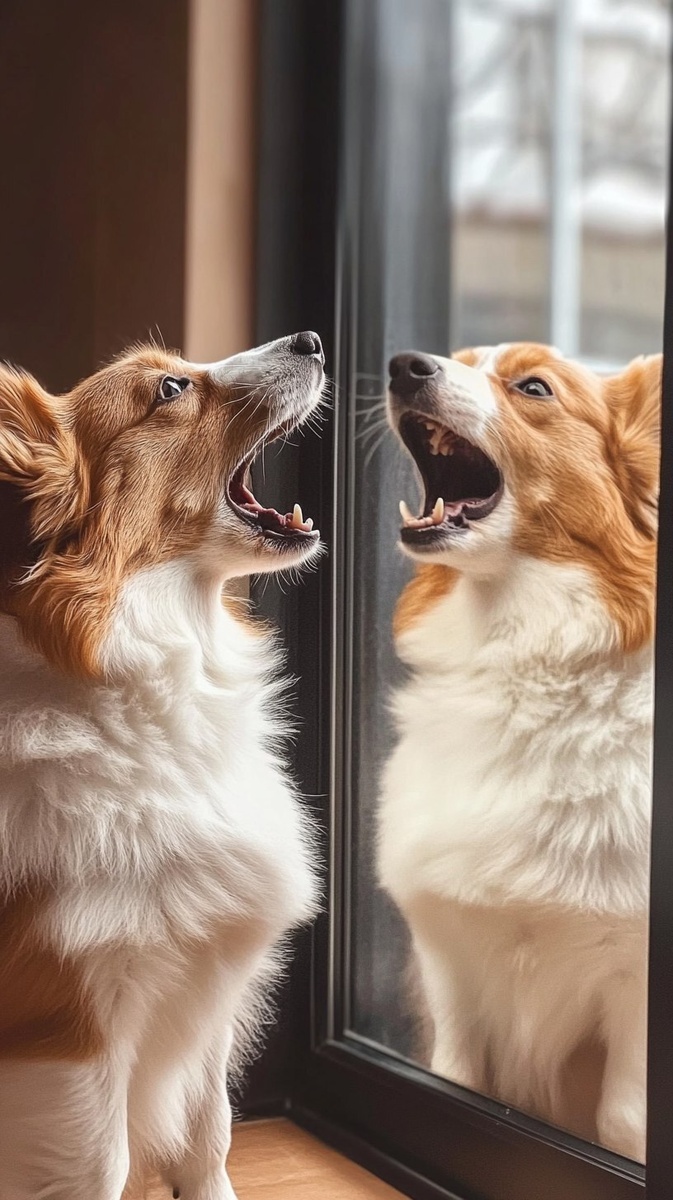 Создано на основе запроса: ultra realistic photo of dog barking at his reflection in the mirror