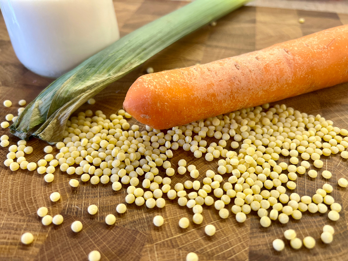 Существует огромное количество пасты. Мы души живые и макаронные, так что употребляем их регулярно. Но в основном, конечно, всякие фузили, да спагетти. Консерватизм нашего семейства не знает границ. Иногда правда проскакивает то тут, то там (парам пам пам) и другие, не менее замечательные, представители этого восхитительного глютенового царства. Лингвини, орзо, фарфале и так далее и так далее. Но сегодня я хотела поведать вам о милых шариках под названием птитим. Они вполне способны разнообразить семейный рацион, правда чмок ими не сделаешь. Тут скорее будет хлюп. Ну, в том варианте, который я сегодня предлагаю. Ингредиентов минимум, вкуса максимум. При чем менять продукты можно по своему вкусу. Не угодна морковь? Возьмите перец. Не любите перцы? Тащите помидоры. Птитим не подошел? Доставайте спагетти. Ну а у нас сегодня морковка, да порей. И главный ингредиент блюда - вода из под пасты. Она царица, она всеми правит, она всех объединит. Приступим. Сварите морковь. Самым прозаичным о