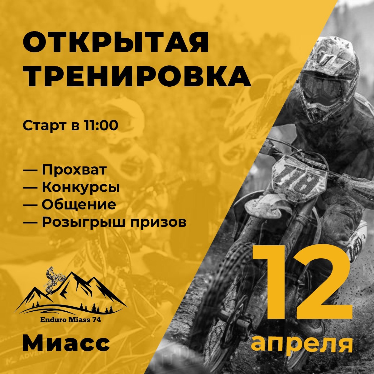 🏍 ОТКРЫТАЯ ТРЕНИРОВКА🏍 Приглашаем всех желающих на открытую тренировку под Миассом! Трасса живописная и разнообразная по уровню подготовки: от Лайта до Харда — каждый найдёт для себя подходящий режим. 📅 Дата: 12 апреля ⏰ Время сбора: 11:00 📍 Точка сбора: 55.380476, 60.269019 Важно: 🔹 Обязательна полная экипировка (без мотобот не допускаем!) 🔹 Участие бесплатное Готовы прокачать навыки и зарядиться адреналином? Ждём вас! 💥