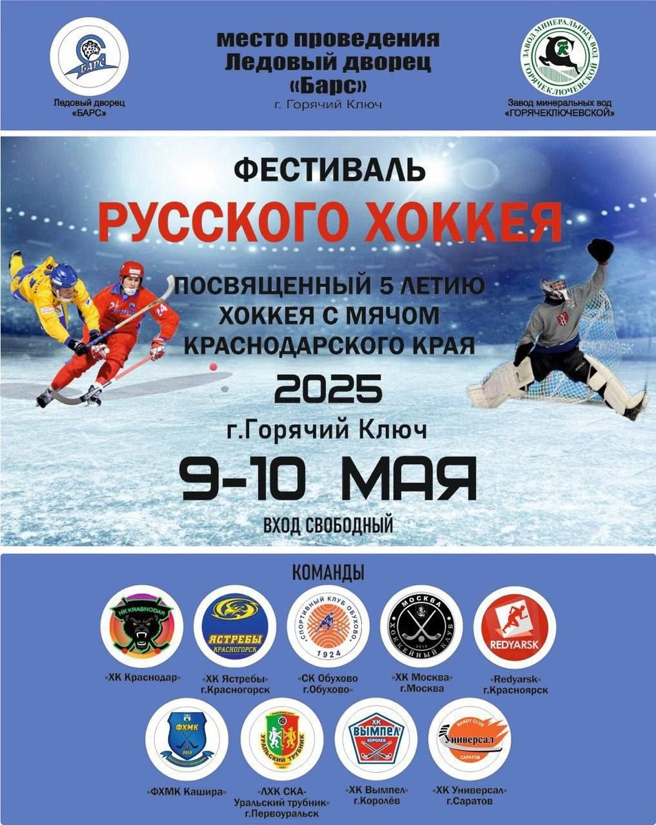 Красноярская команда по хоккею с мячом РедЯрск примет участие в фестивале русского хоккея в Горячем Ключе. Так же на черноморское побережье приедут команды из Первоуральска, Саратова, Москвы, подмосковных Обухово, Королева, Красногорска и Каширы. Матчи пройдут в ледовом дворце "Барс". Фестиваль посвящен 5-летию хоккея с мячом Краснодарского края.
