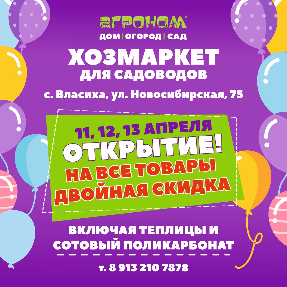 Здесь вы можете купить все для дома, сада и огорода в одном месте. Хозмаркет «АГРОНОМ» — это все от самореза до теплицы! Только три дня — 11, 12 и 13 апреля — всем покупателям выдают бесплатно дисконтные карты хозмаркета «АГРОНОМ» и сразу делают двойную скидку на все товары — включая теплицы и сотовый поликарбонат. Приходите на открытие нового хозмаркета «АГРОНОМ» по адресу: ул. Новосибирская, 75. +7 (913) 210-78-78. Подписывайтесь на «АГРОНОМ», делитесь ссылкой с родными и близкими. 16+. Реклама, ИП Яковлев А. В. Erid: F7NfYUJCUneRHyWfYGWs