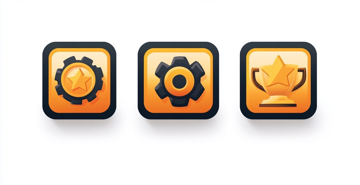 Создано на основе запроса: 4 icons for a mobile game in the style of Unreal Engine, a vector icon set on a white background with black outlines. The set includes an MMORPG button, a trophy cup with a gear wheel and a star ribbon, in shades of orange and a bright yellow color palette, using simple shapes and a 3D render. --- Автоперевод: 4 значка для мобильной игры в стиле Unreal Engine, векторной иконки, установленной на белом фоне с черными очертаниями. Классно вышло? 🤔 https://dzen.ru/id/65c0c65c86e4f837c27b24d7 #ИИ #AI #нейросеть #midjourney #art