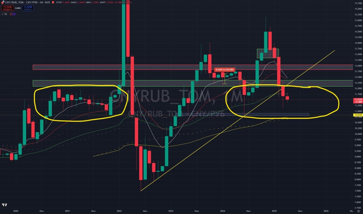 #доллар Спросили меня сейчас по валюте: стоит ли заранее в рубли конвертировать перед сделкой в мае или еще подрастет. Конечно, я не знаю, куда там двинется курс. Особенно, в такой неопределенности. Но я решил посмотреть на график юаня к рублю. Единственный, кто торгуется на бирже. Нефть по 60 и бюджет - это все прикольно, но я пока на графике не вижу никаких признаков к качественному росту. Волатильность - да, но не рост. Учитывая, как выглядит график на старших масштабах, я могу пока только рассматривать варианты в пользу снижения. У юаня есть важный уровень 10.84, который при таком уж близком подходе к нему, грех не протестировать и почти 100%, что оттуда будет сильный отскок. Но... Будет ли это отскок или разворот - я пока иллюзий не питал бы. Потому что могут дальше прижать и повести уже ниже 10р. И то же самое по доллару. Пока что я допускаю вариант, что в первой цифре курса мы можем увидеть 6Х. Во всяком случае мы висим сейчас в таком месте, где такой срыв вполне вероятен.
